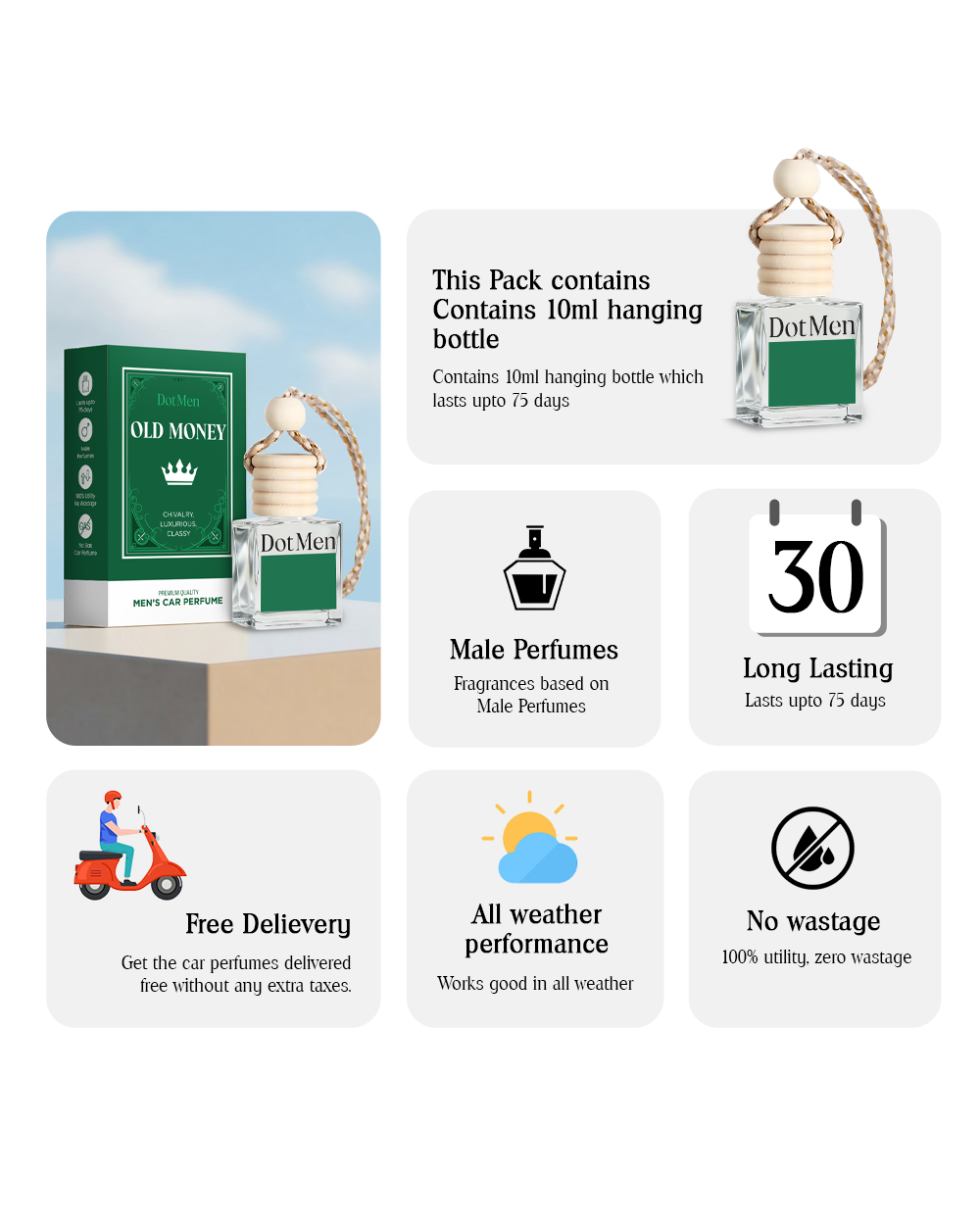 - Long Lasting: 10ml hanging bottle with 100% Perfume Concentration, lasting upto 75 days